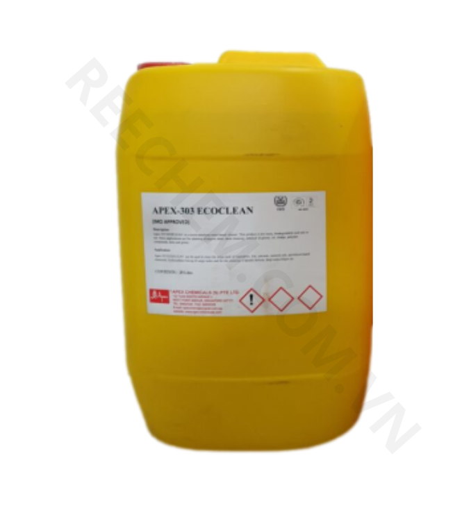 APEX-303 EcoClean là chất tẩy gốc nước dạng vi nhũ tương, có độc tính thấp, có khả năng phân hủy sinh học, và an toàn khi sử dụng. APEX-303 EcoClean có chiết xuất từ tinh dầu cam quýt tự nhiên kết hợp với chất hoạt động bề mặt được cải tiến ứng dụng để làm sạch buồng động cơ, sàn tàu, loại bỏ dầu nhờn, các hợp chất Polymer, than carbon, và các loại cáu bẩn khác.
