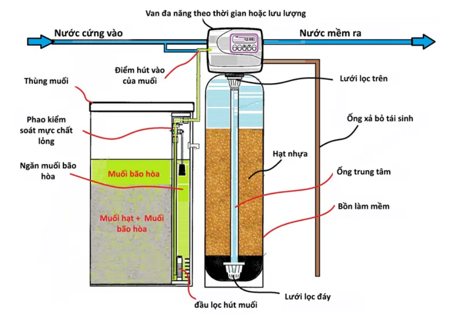 Với một hệ thống làm mềm nước thông thường. Cơ chế làm mềm bao gồm một loại hạt nhựa trao đổi cation trong đó các nhóm chức anion sulphonat (SO 3 – ) được cố định vào ma trận hạt nhựa trao đổi ion. Sau đó, một dung dịch đối ion chứa các cation natri (Na + ) được áp dụng cho hạt nhựa. Na + được giữ lại với các anion SO 3 – cố định bằng lực hút tĩnh điện, tạo ra điện tích trung tính ròng trong hạt nhựa. Trong chu trình hạt nhựa trao đổi ion hoạt động, một luồng chứa các ion độ cứng (Ca 2+ hoặc Mg 2+ ) được thêm vào hạt nhựa trao đổi cation. Vì các nhóm chức SO 3 – có ái lực lớn hơn đối với các cation độ cứng so với các ion Na + , các ion độ cứng sẽ đẩy các ion Na + ra khỏi hạt nhựa như một phần của nước được xử lý . Mặt khác, các ion độ cứng (Ca 2+ hoặc Mg 2+ ) được giữ lại bởi hạt nhựa trao đổi ion.