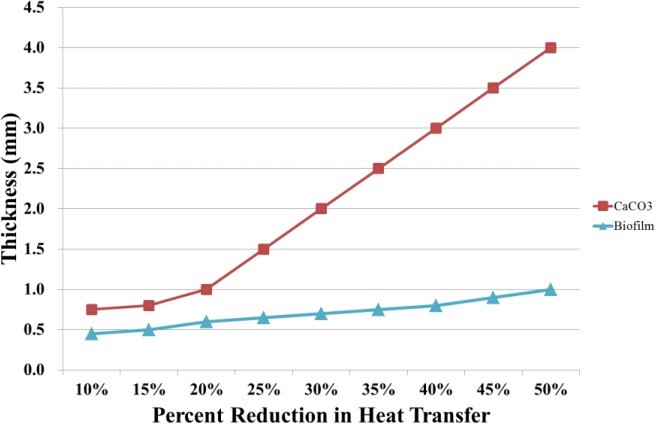 - Trường hợp cáu cặn do sắt, % điện năng tiêu thụ tăng thêm nhiều hơn lên 1,5 lần (Ví dụ tại 0.76mm, canxi= 27%, sắt = 40%).