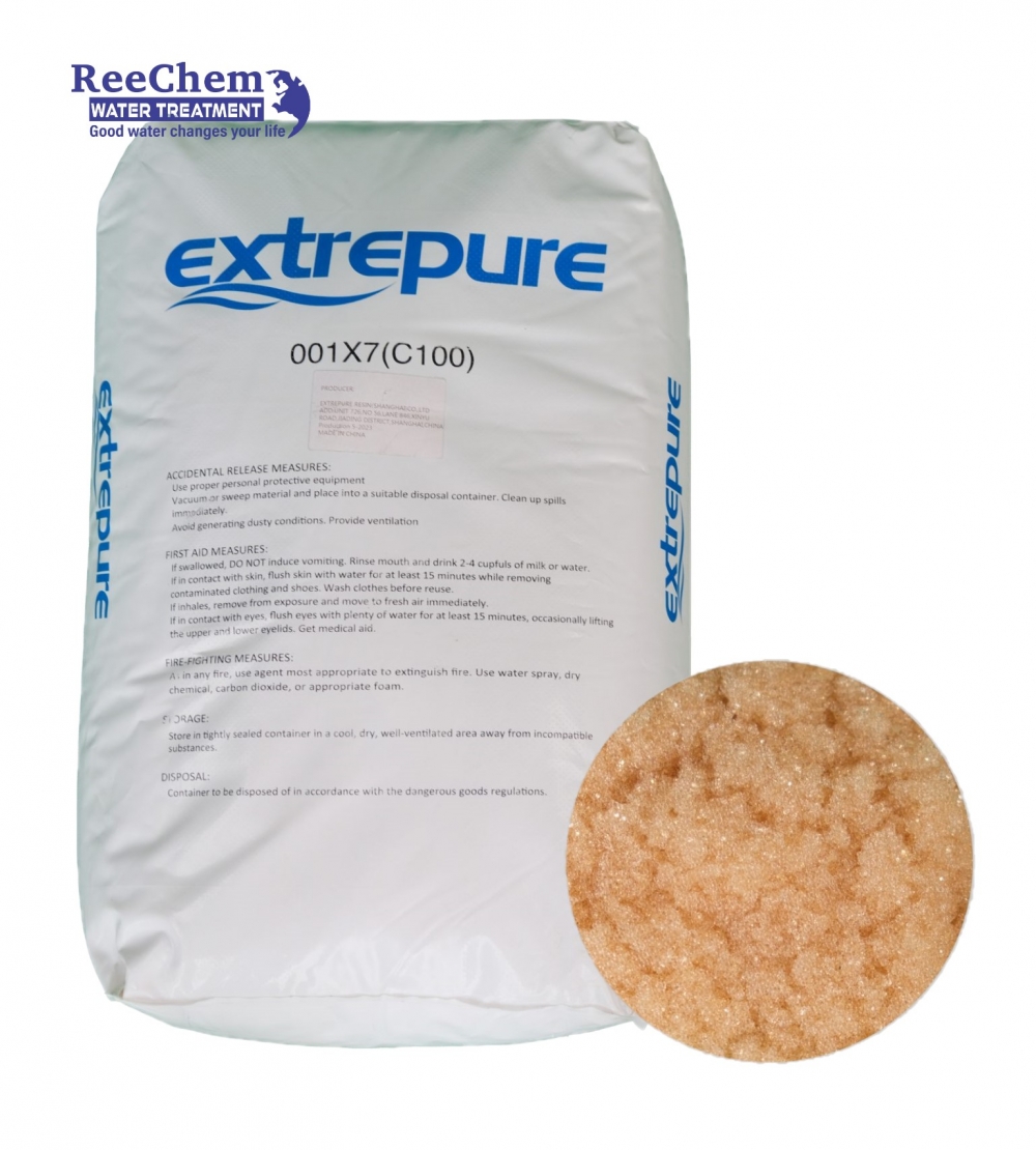 Extrepure 001*7 là hạt nhựa cation axit mạnh dạng gel, có cấu trúc styrene-divinylbenzene (S-DVB) và nhóm chức axit sulfonic (-SO₃H). Khi nước cứng đi qua lớp hạt nhựa, các ion Ca²⁺, Mg²⁺ bị giữ lại, thay thế bằng ion Na⁺, giúp nước trở nên mềm hơn, giảm cặn bám trong thiết bị, đường ống và cải thiện hiệu suất hệ thống.