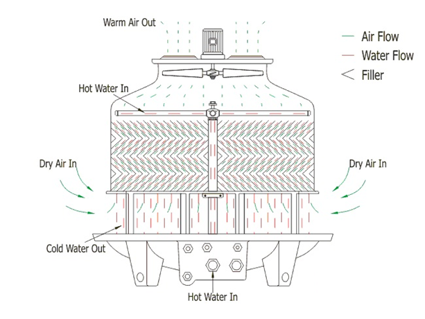 Trong lúc đó, nguyên lý tháp giải nhiệt sẽ sử dụng không khí mát từ bên ngoài đưa vào tháp ở cửa vào nằm dưới đáy tháp. Không khí sẽ di chuyển ngược lên, đi qua tấm tản nhiệt, tiếp xúc với nước và cuốn theo hơi nước nóng đưa ra môi trường bên ngoài.