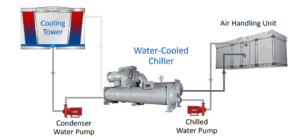 Trong hệ thống Water Chiller, thì Chiller đóng vai trò là trung tâm của cả hệ thống và chia hệ thống ra làm 2 pha rõ rệt: Pha làm lạnh gồm Bình bay hơi của chiller cùng các thiết bị AHU, FCU. Pha giải nhiệt gồm Bình ngưng tụ Chiller và Cooling Tower. Bản chất Chiller là thiết bị tạo ra nước lạnh, nước lạnh này được bơm tới các thiết bị sử dụng như FCU, AHU. Tại đây, nước lạnh trao đổi nhiệt với không khí, sau đó nước lại nóng lên và sẽ quay trở lại Chiller nhả nhiệt vào Gas lạnh và tiếp tục 1 vòng tuần hoàn mới. Tùy theo thiết kế của hệ thống mà có thể có các hệ thống bơm khác nhau được sử dụng. Hệ bơm phổ biến thường gặp là Primary - Secondary hoặc VPF.